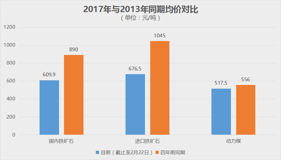 對(duì)鋼鐵生產(chǎn)企業(yè)來說,目前可以算是一個(gè)美好的時(shí)代,因?yàn)殇搩r(jià)創(chuàng)下新高,但原燃料成本卻并沒有恢復(fù)到相應(yīng)的水平,讓此前長期在虧損邊緣掙扎的鋼鐵生產(chǎn)企業(yè)終于有了豐厚的盈利。蘭格鋼鐵云商平臺(tái)數(shù)據(jù)監(jiān)測顯示,截止到2月22日,相關(guān)價(jià)格與四年前同期對(duì)比如下:
